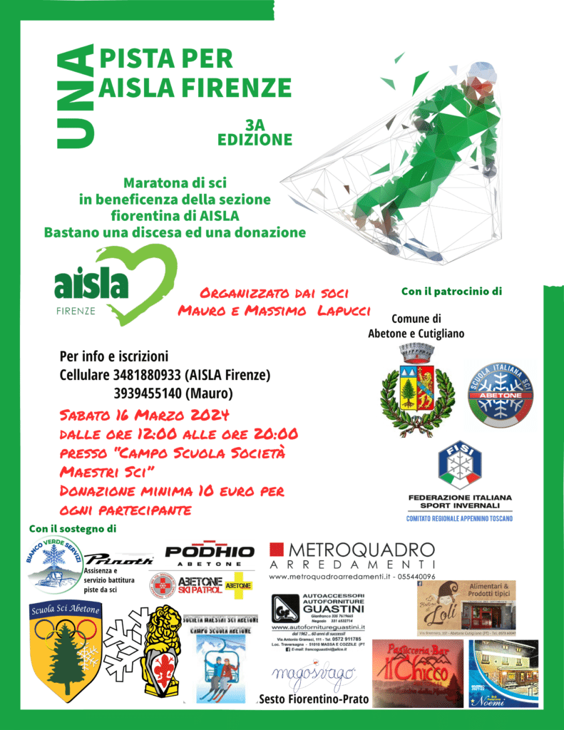 Pistoia, 12 mar.In una Abetone finalmente innevata va in scena la terza edizione sabato 16 marzo di “Una pista per Aisla Firenze”, che torna a unire lo sport con la solidarietà. L’evento si svolgerà dalle 12:00 alle 20:00 presso il Campo Scuola all’Abetone. “Una pista per Aisla Firenze” è fortemente voluta da due Soci, i due fratelli Mauro e Massimo Lapucci, il primo, Sciatore Master a livello internazionale e l’altro, Maestro associato alla Scuola Italiana Sci in Abetone, che hanno perso la madre a causa della Sla, assistita dall’associazione.