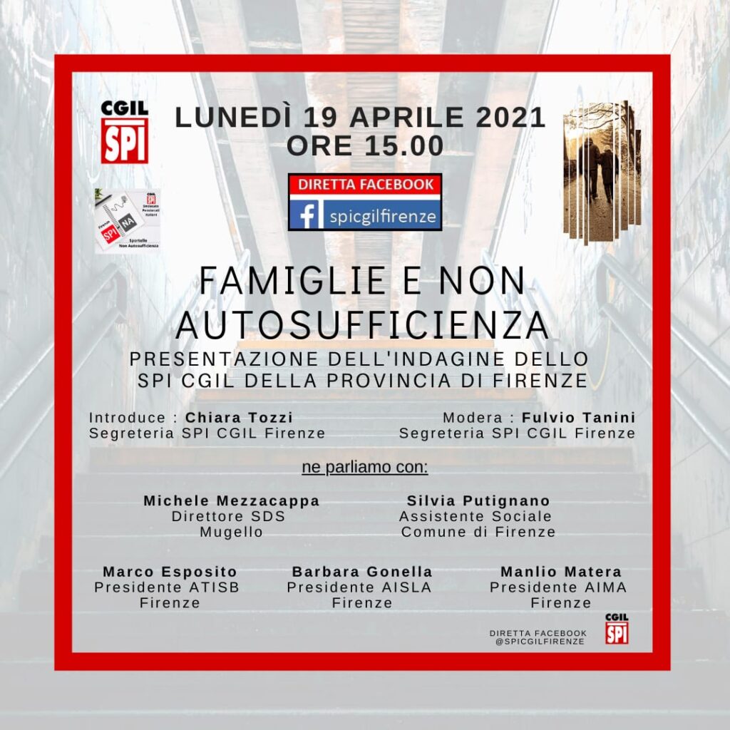 “Famiglie e non autosufficienza”: sindacato e Terzo Settore a confronto per mettere in luce problemi, bisogni ma soprattutto strategie comuni in sostegno delle fragilità familiari con focus sul caregiver, una figura da riconoscere maggiormente. Alla presentazione dell’indagine promossa da SPI CGIL Firenze in programma lunedì 19 aprile alle ore 15:00 sulla pagina Facebook (https://www.facebook.com/spicgilfirenze).