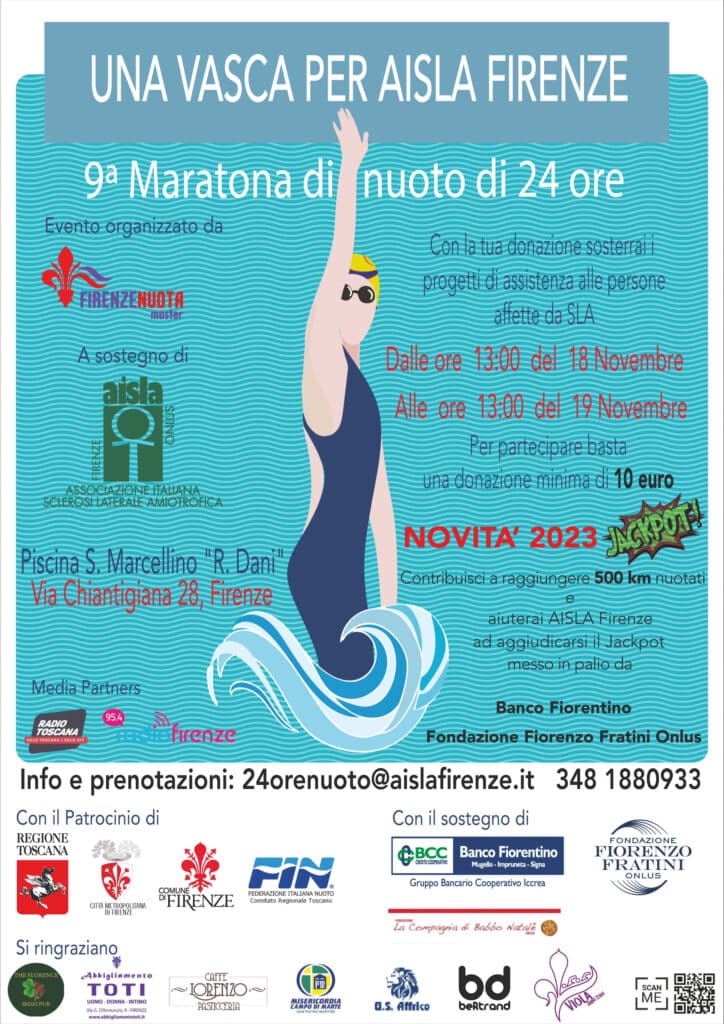 Torna la maratona di nuoto di ventiquattro ore per le persone con Sla: è la nona edizione che si svolgerà all’impianto dell’U.S. Africo San Marcellino. Un traguardo importante per Aisla Firenze che ha mantenuto e rinnovato questo appuntamento, superando anche la prova del Covid. Per il secondo anno consecutivo anche Aisla Prato organizza una maratona di nuoto in contemporanea. Per quest’anno, grazie al Banco Fiorentino e alla Fondazione Fratini, tra major donors dell’iniziativa, è stato istituito un “jackpot” da 3000 euro ma solo a una condizione: superare il record dei 500 km nuotati (20.000 vasche).